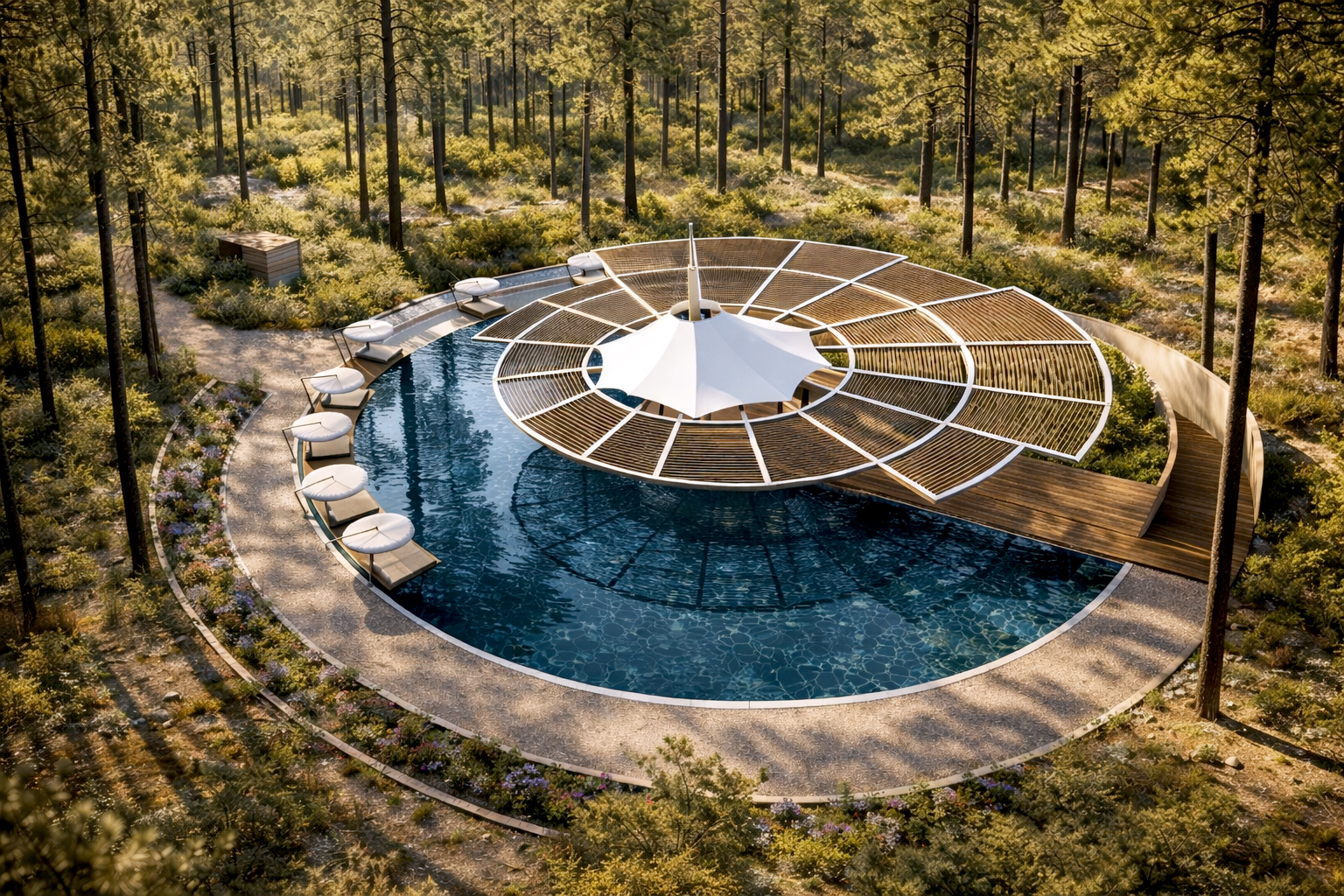 Instead of a single large-scale swimming pool—typical of grand resort developments—the design proposed a series of smaller pools, strategically distributed across naturally occurring clearings within the site. Additional planting was introduced around the pools to enhance microclimatic comfort and reinforce the project’s integration with the surrounding landscape.