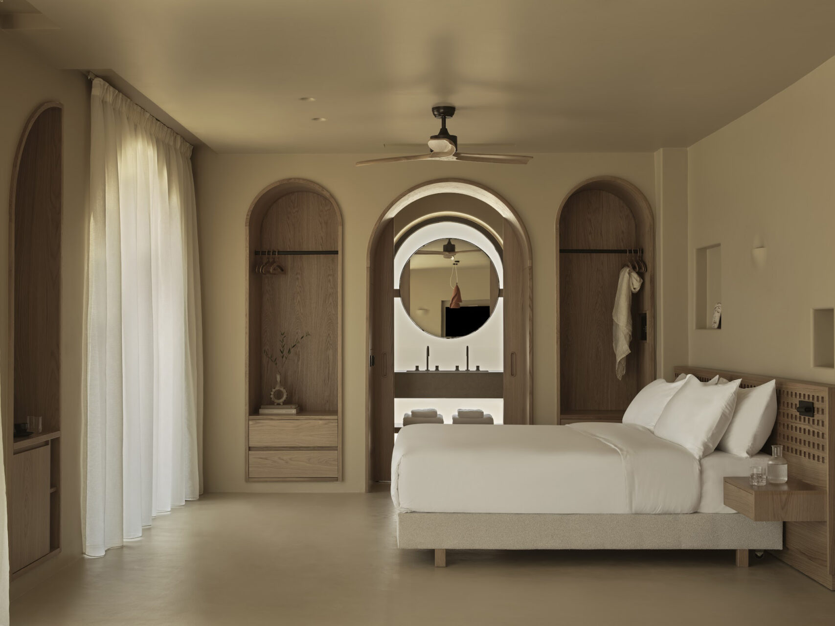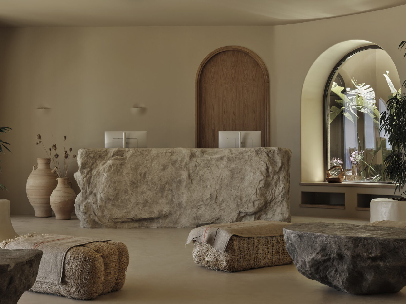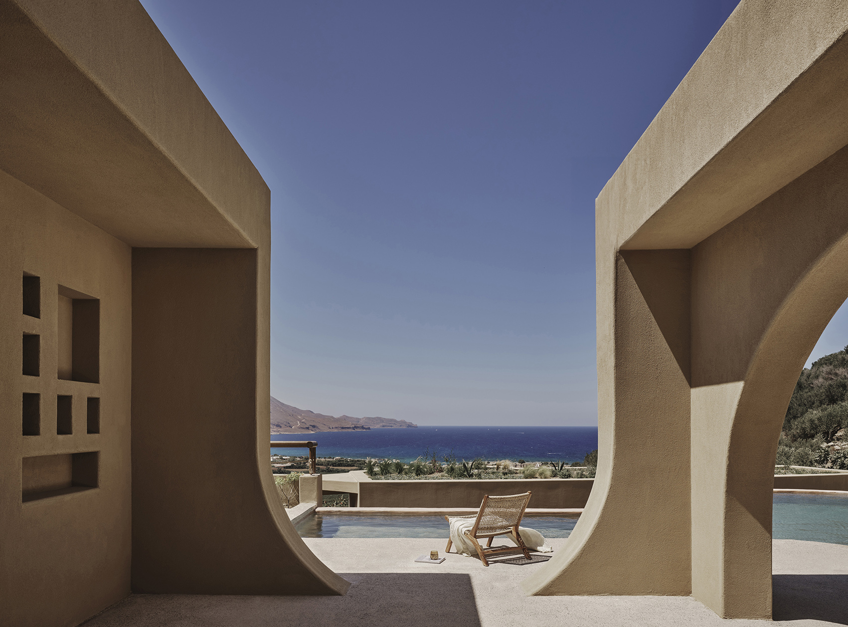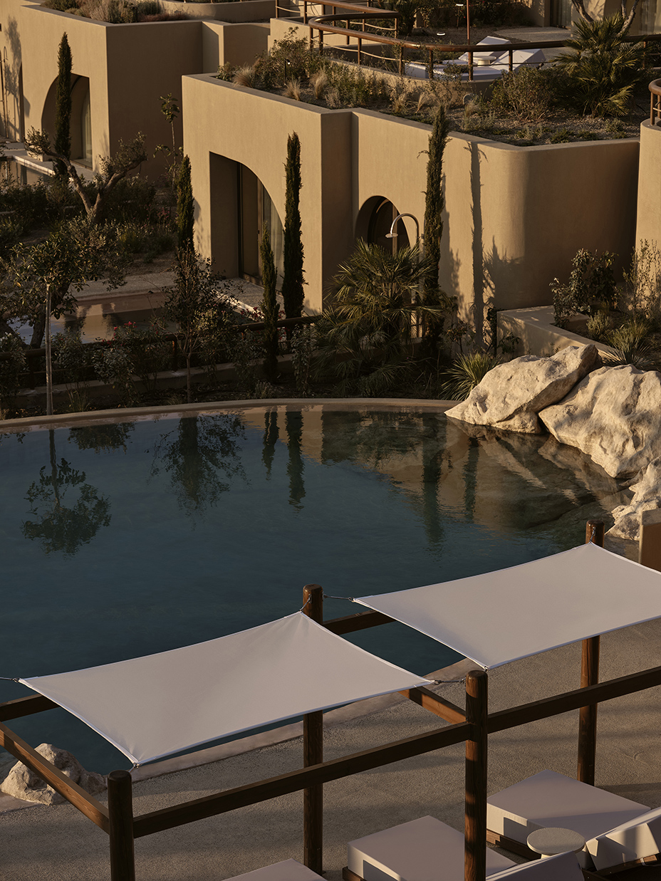 Inspired by Chania’s Venetian arches and Crete’s cave dwellings, the hotel reinterprets tradition through a rhythmic façade of full and half arches, leading to interiors sculpted in continuous microcement finishes.