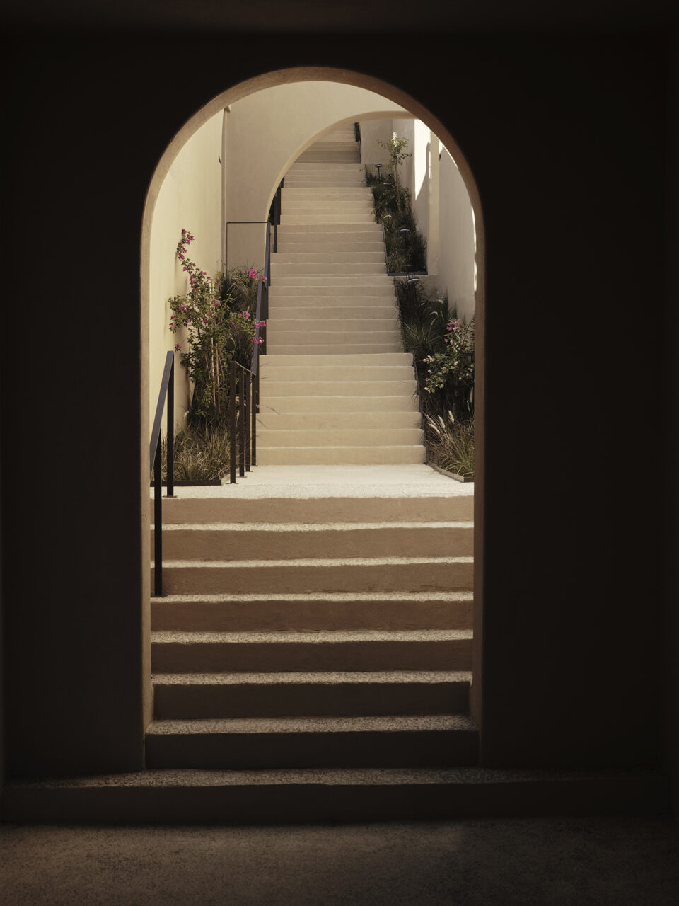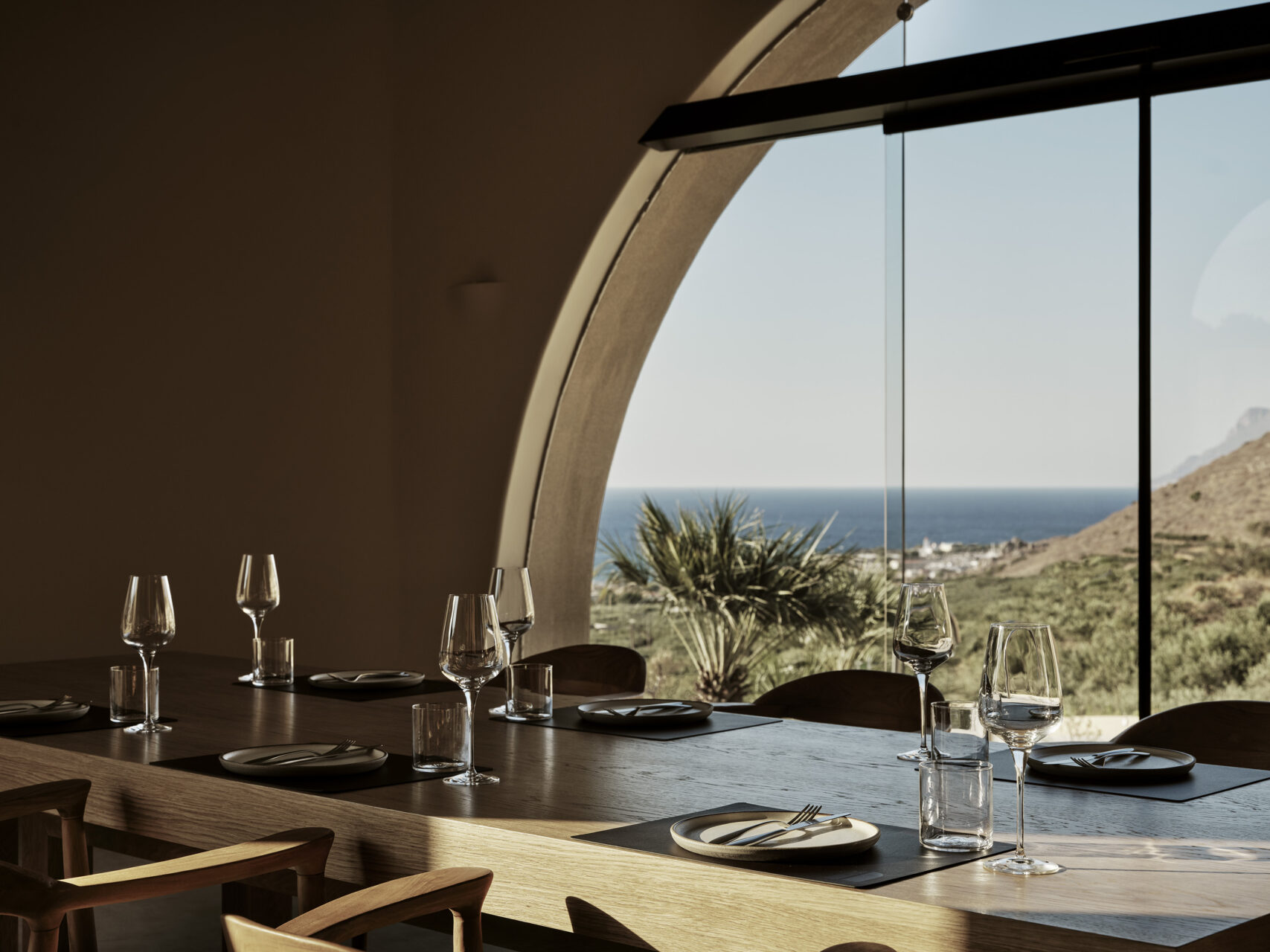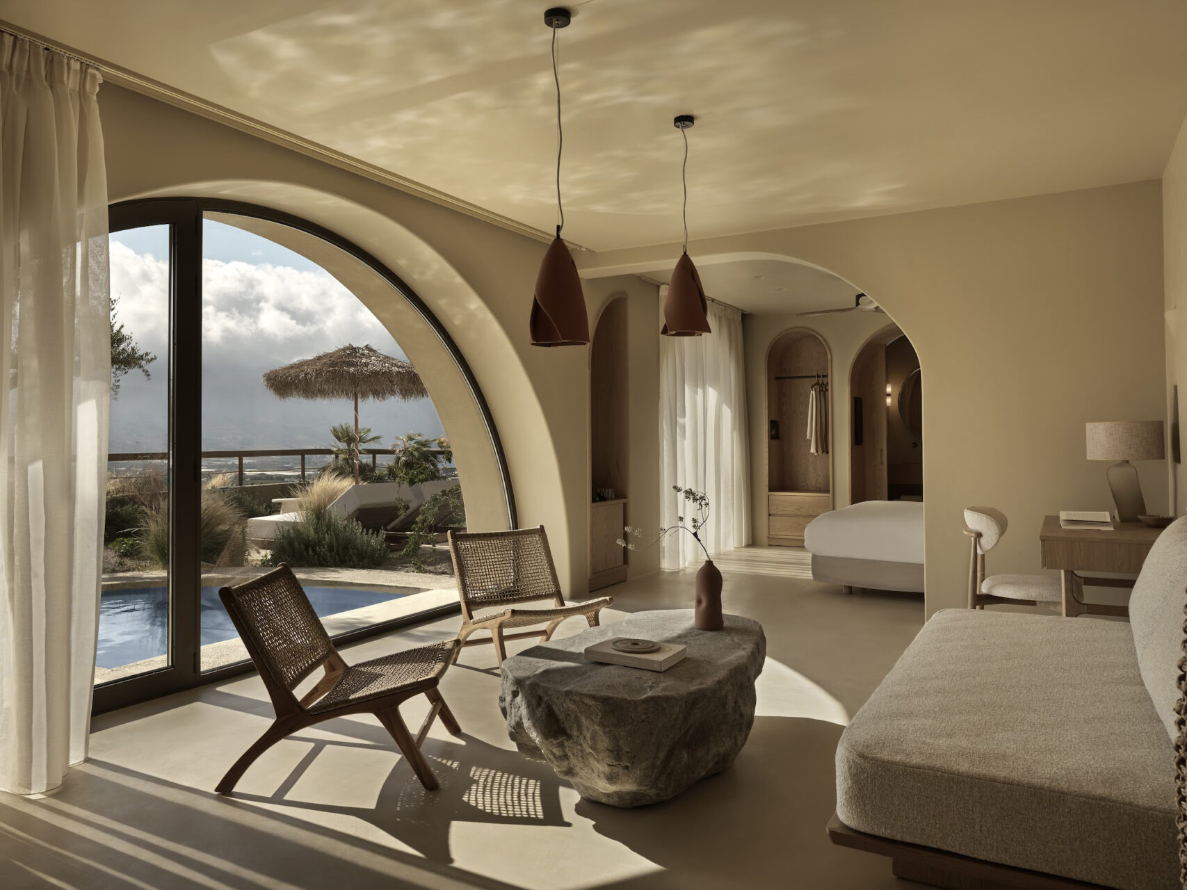 Inspired by Chania’s Venetian arches and Crete’s cave dwellings, the hotel reinterprets tradition through a rhythmic façade of full and half arches, leading to interiors sculpted in continuous microcement finishes.