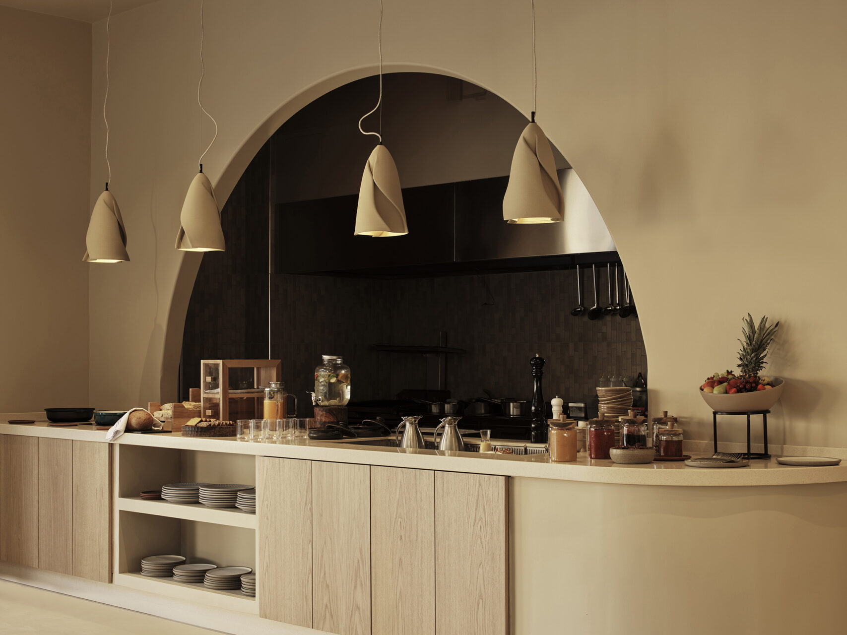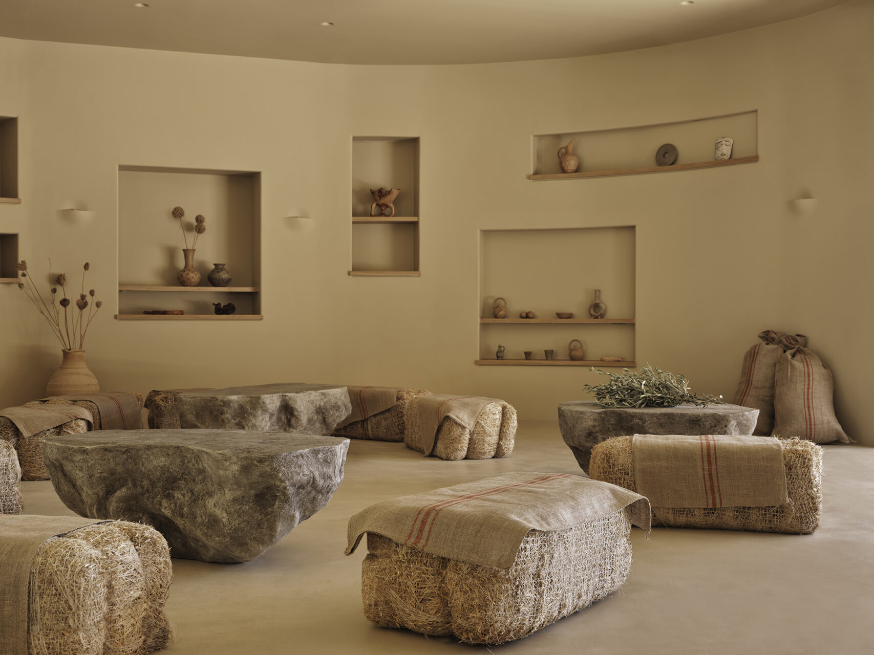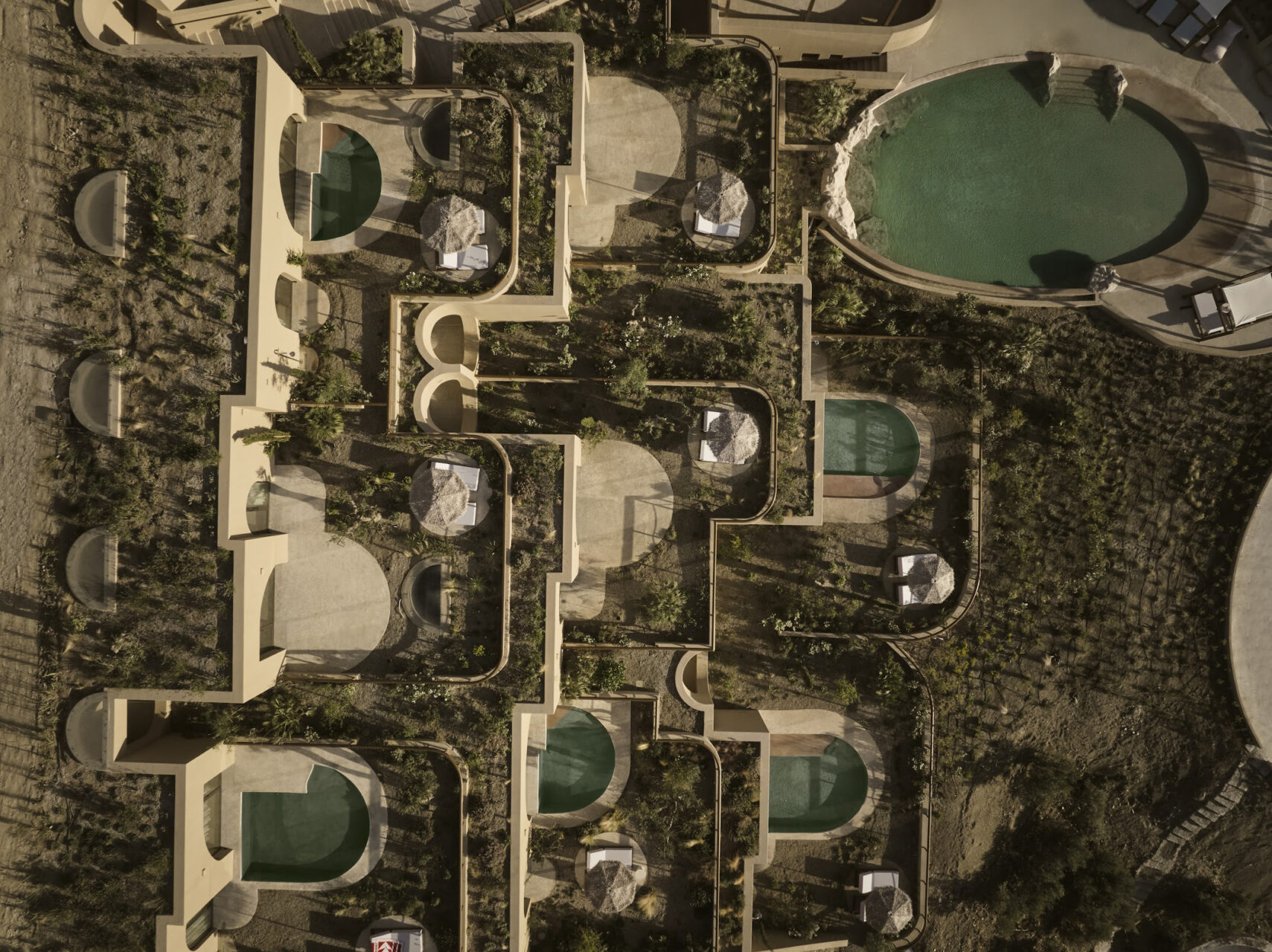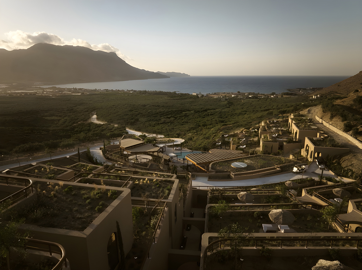 Inspired by Chania’s Venetian arches and Crete’s cave dwellings, the hotel reinterprets tradition through a rhythmic façade of full and half arches, leading to interiors sculpted in continuous microcement finishes.