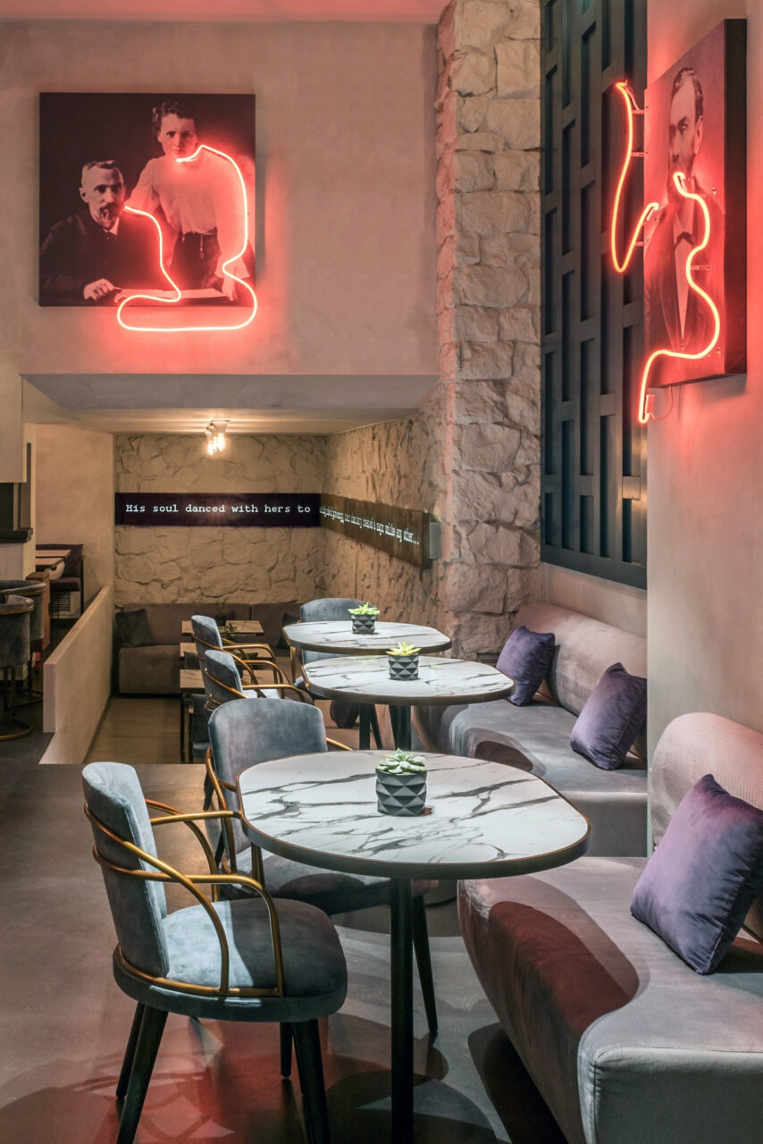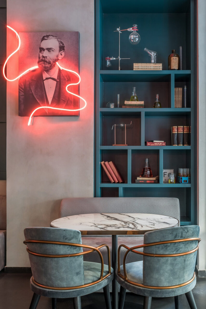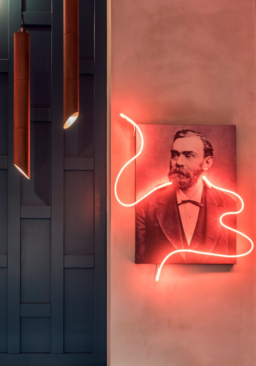 Lighting plays a central narrative role. Custom neon interventions trace historic portraits, symbolically “activating” them — as if energy were flowing through matter. Warm copper pendants descend like suspended instruments, directing light with intention and intimacy. The contrast between the deep teal backdrop and the warm amber glow creates a theatrical tension between control and emotion — science and romance.