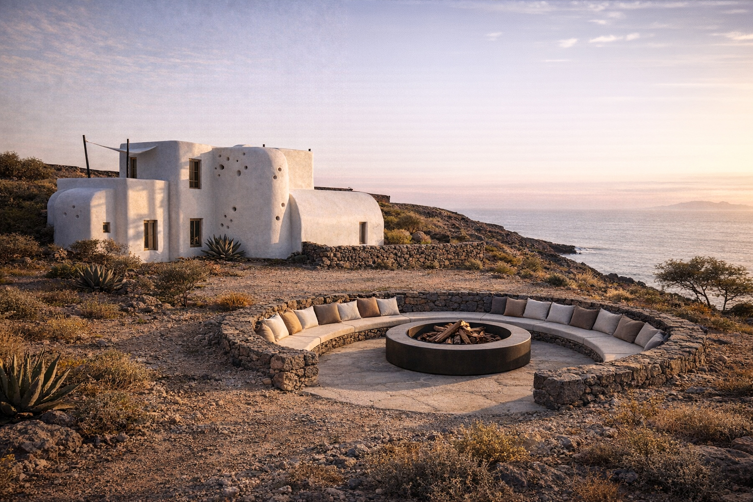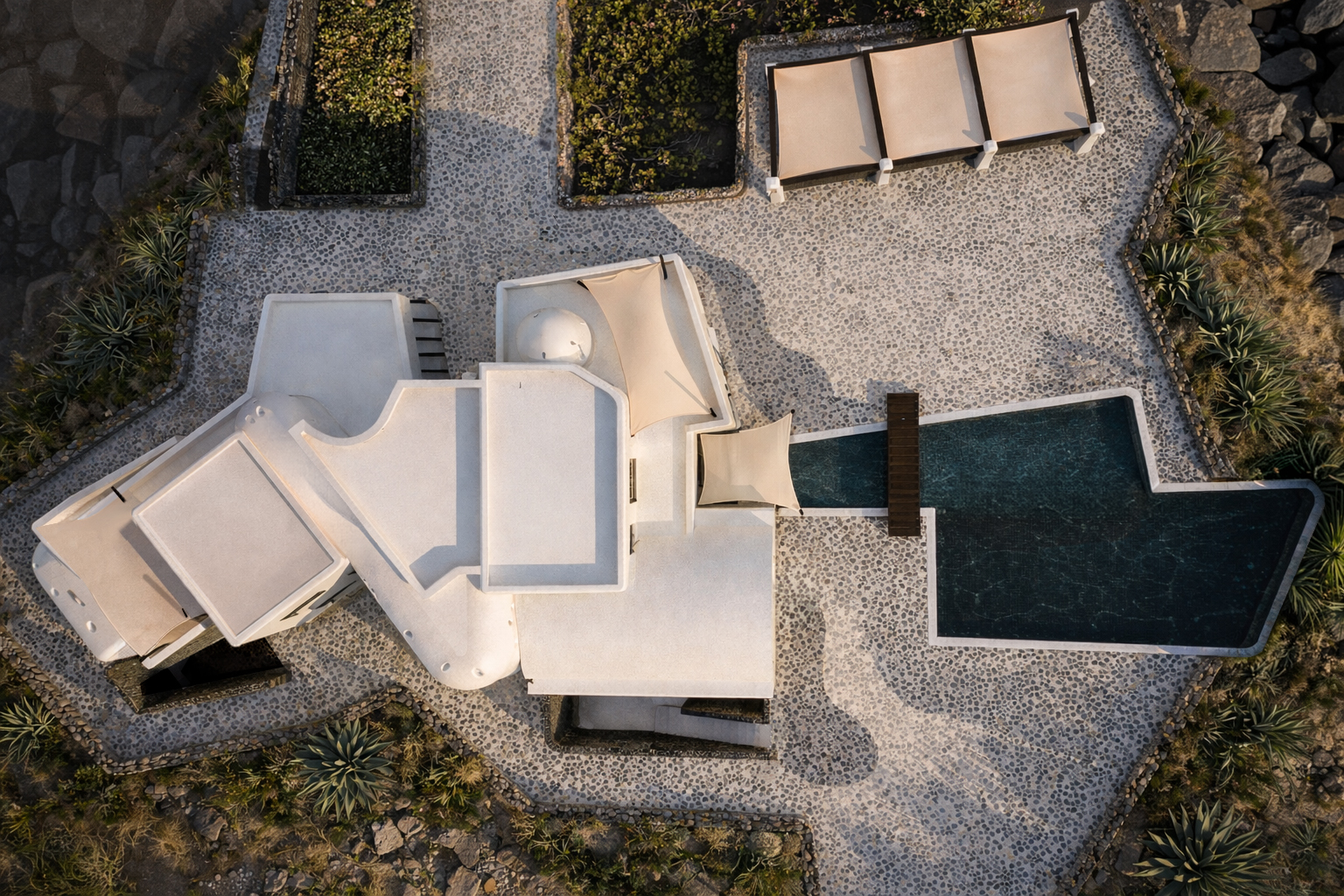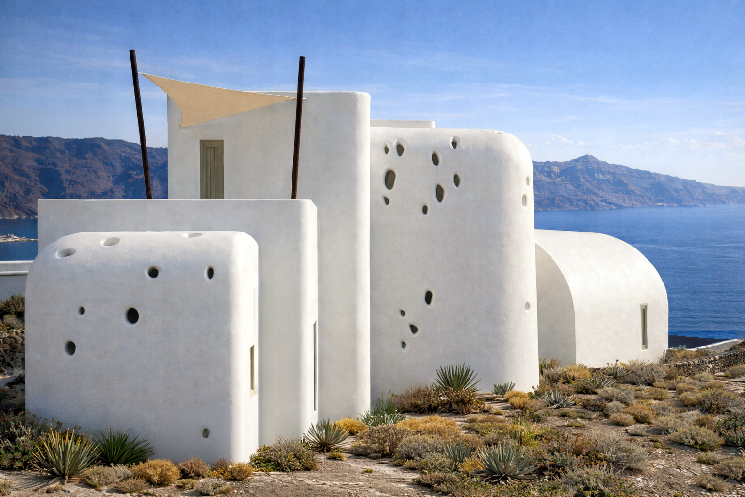 The building appears as a rock cast from the caldera of the volcano after a vigorous eruption while its mass and skin have been sculptured over time by the forceful seaside winds and the erosion of the sea water.