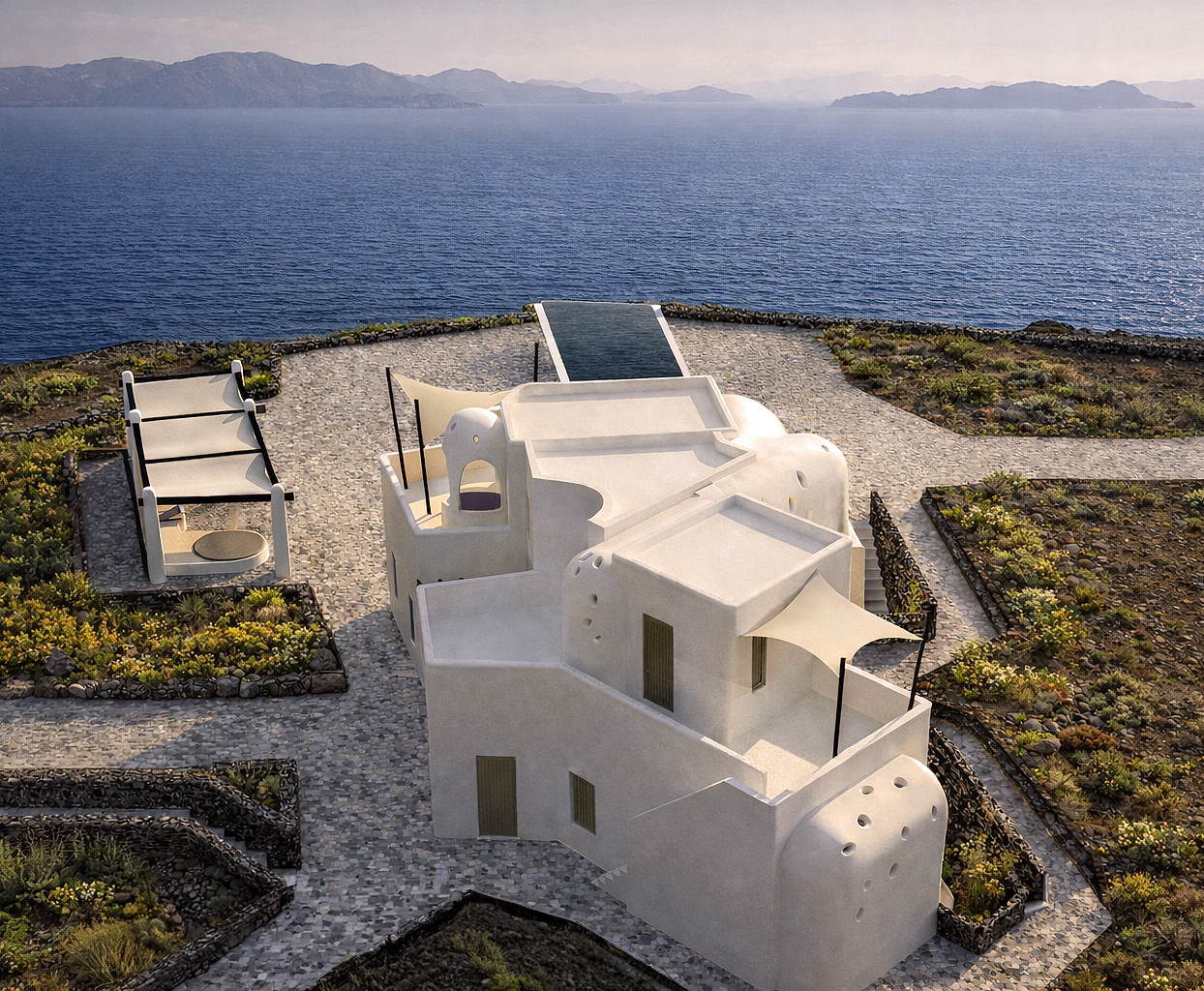 The residence reinterprets the vernacular architecture of the island through a contemporary architectural language. Its elongated, irregular form emerges from the narrowness of the plot and the deliberate intention to secure uninterrupted views of the sea and horizon from every room.