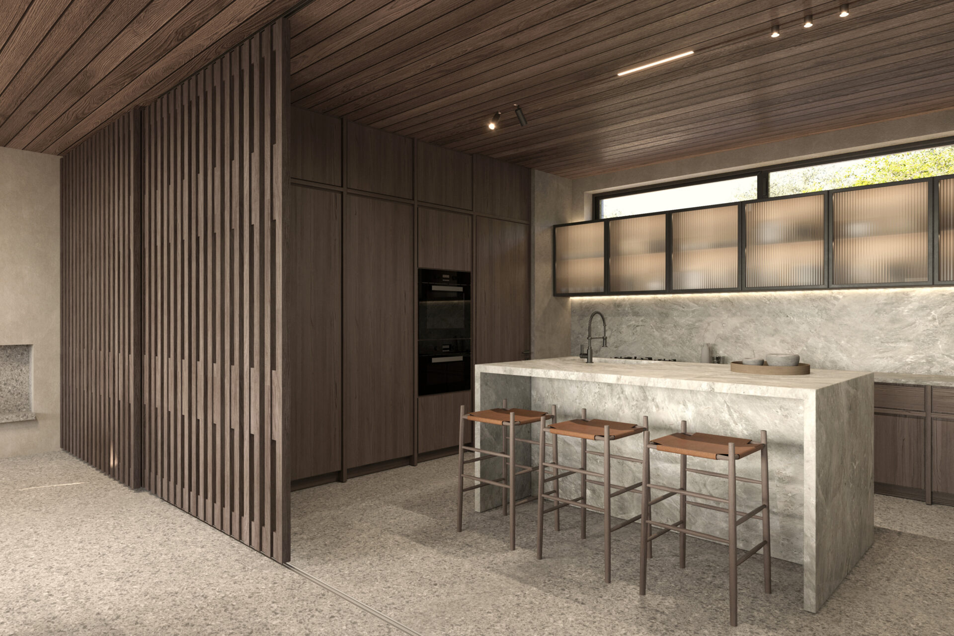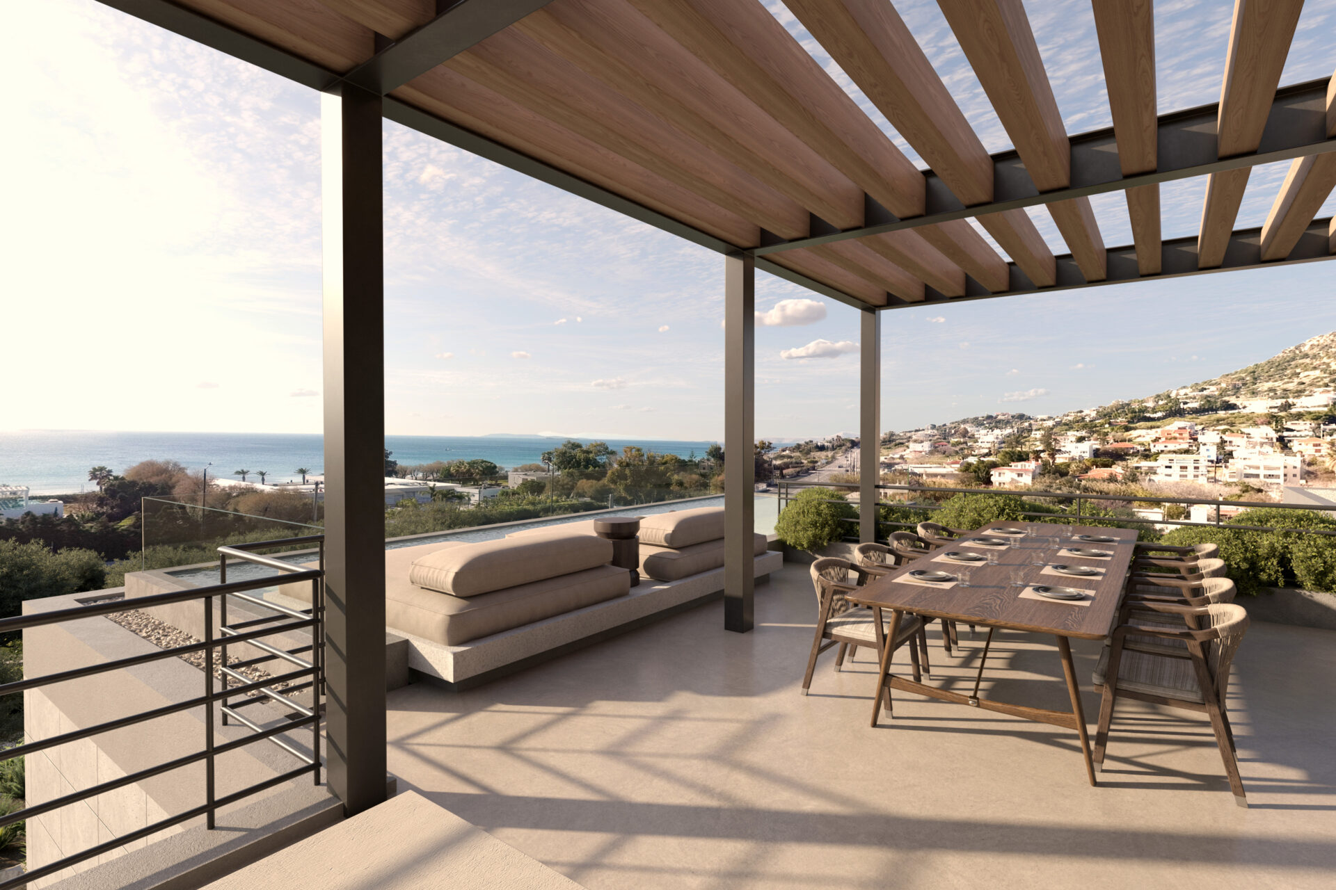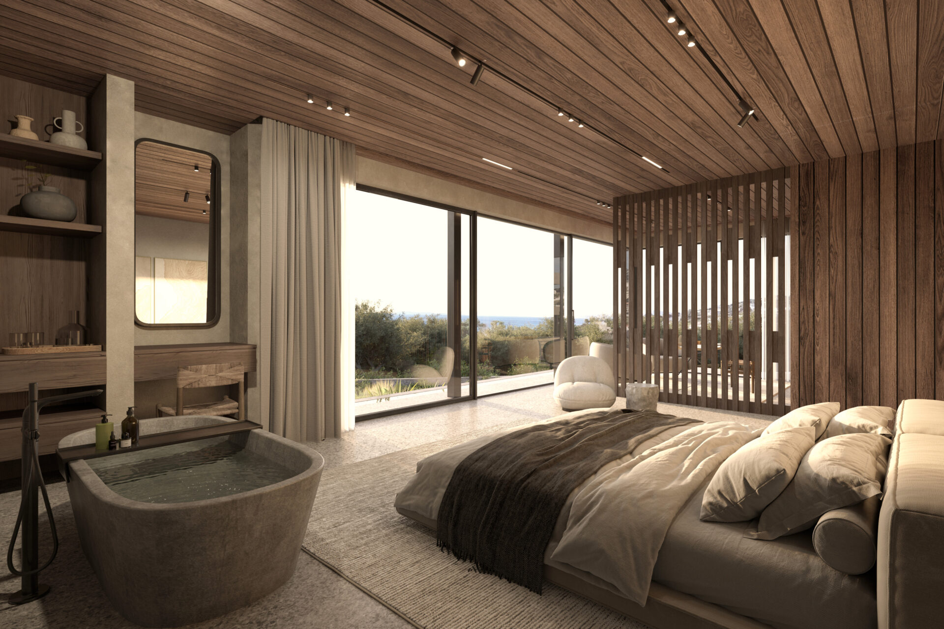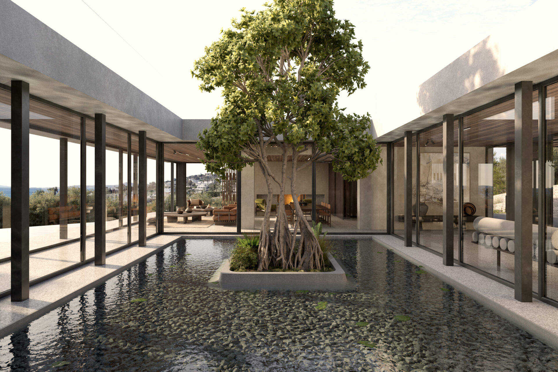 The interior language is intentionally calm and essential. Vertical timber screens subtly articulate space, filtering light while maintaining visual fluidity. The living room, organized around a linear fireplace, frames panoramic views of the Aegean and the surrounding hillside settlement. The dining area aligns axially with the courtyard tree, establishing a deliberate visual connection between ritual, nature, and gathering.