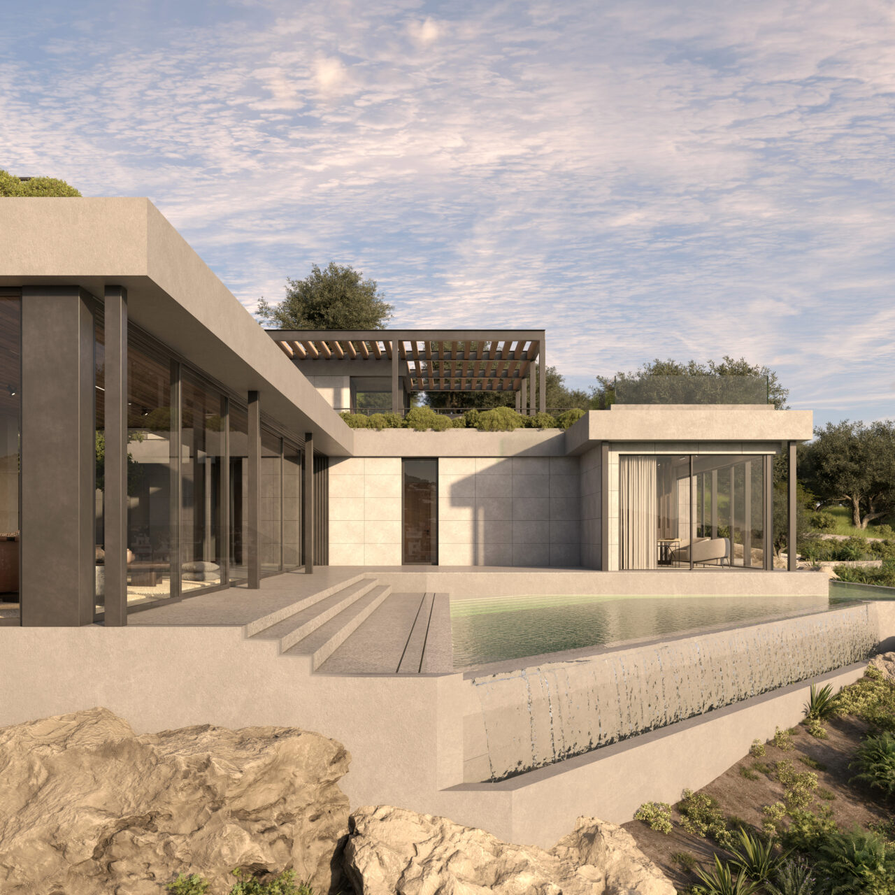 The architecture is conceived as a composition of low, linear volumes that step naturally with the terrain.