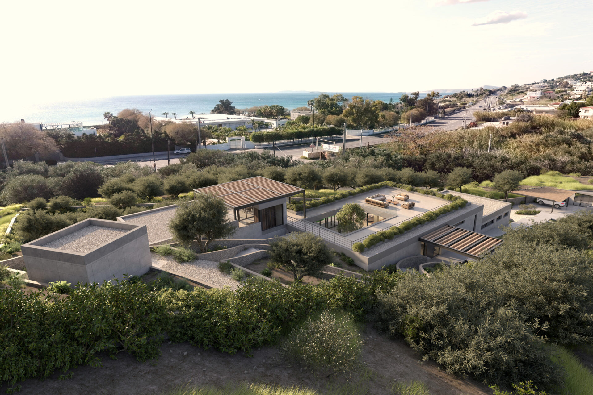 Rather than imposing a singular monumental gesture, the house fragments into interlocking planes, allowing the topography, olive trees, and distant Aegean views to shape its spatial experience.