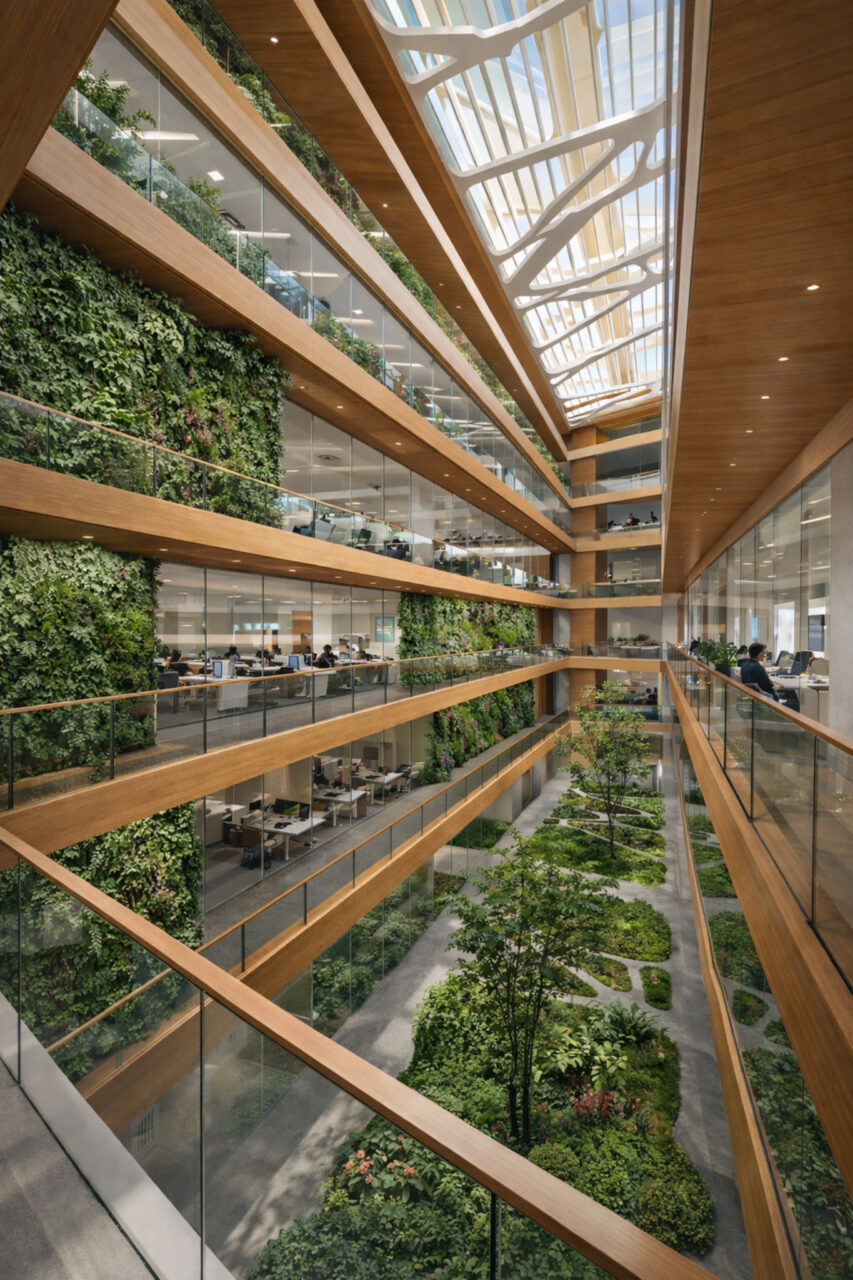 The offices are spread out on six floors around a central atrium, which features a series of vertical garden panels and an internal plaza of indigenous plants. The atrium is sheltered by a sculptural energy roof which includes transparent photovoltaic panels and light diffusers filtering the sunlight inside the internal space.