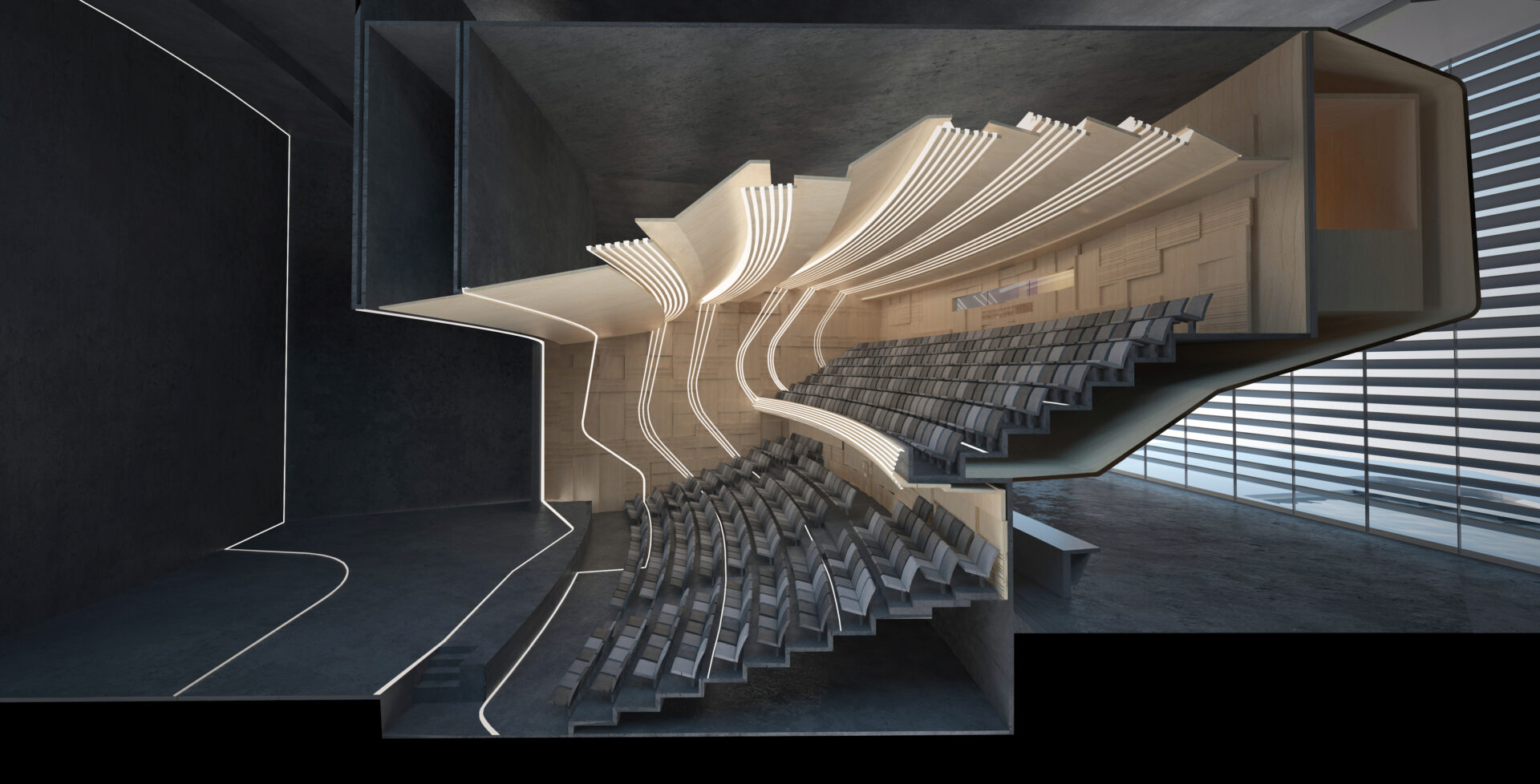 The core of the convention centre is the concert hall which is designed as a twisted mass of concrete and glass. Additional conference suites, a banqueting hall and an exhibition gallery are dotted around the ground and first floor level.