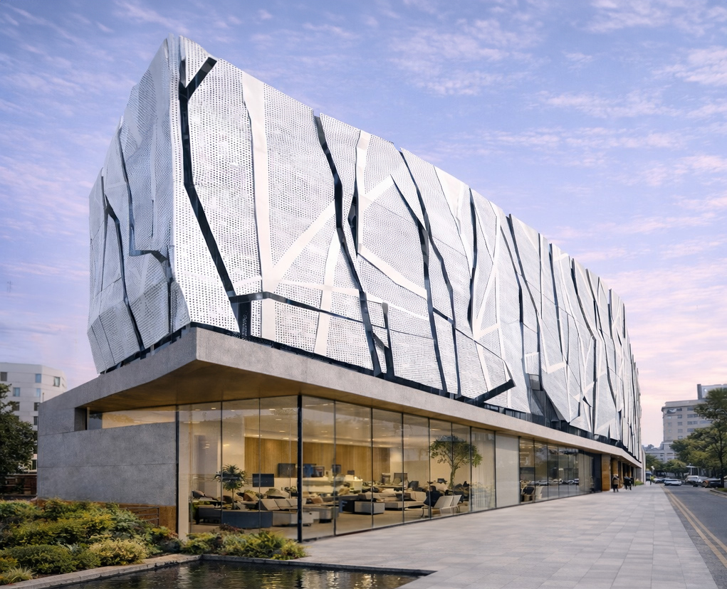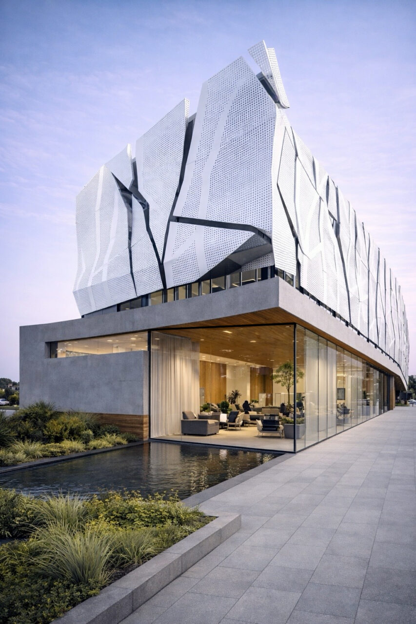 The design features a white faceted aluminum façade with cutouts and patterns, resembling a field of wheat, which makes reference to the bank’s strong historical relationship with the agricultural partnerships.