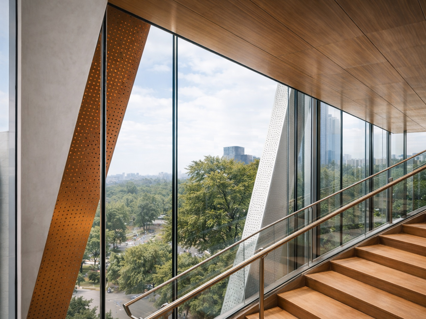 The building’s form emerges directly from the constraints of the challenging triangular site and the need to maximise usable floor area, resulting in an efficient yet expressive architectural solution. In total, the headquarters accommodates 30 work areas and 20 meeting rooms, supported by six strategically distributed coffee stations that promote informal encounters and moments of pause throughout the working day.