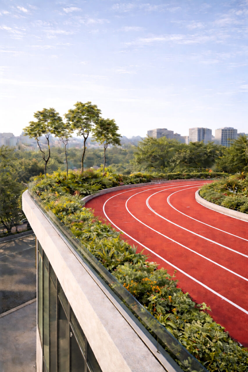 At roof level above commercial level, a continuous running track is integrated into the building’s design.